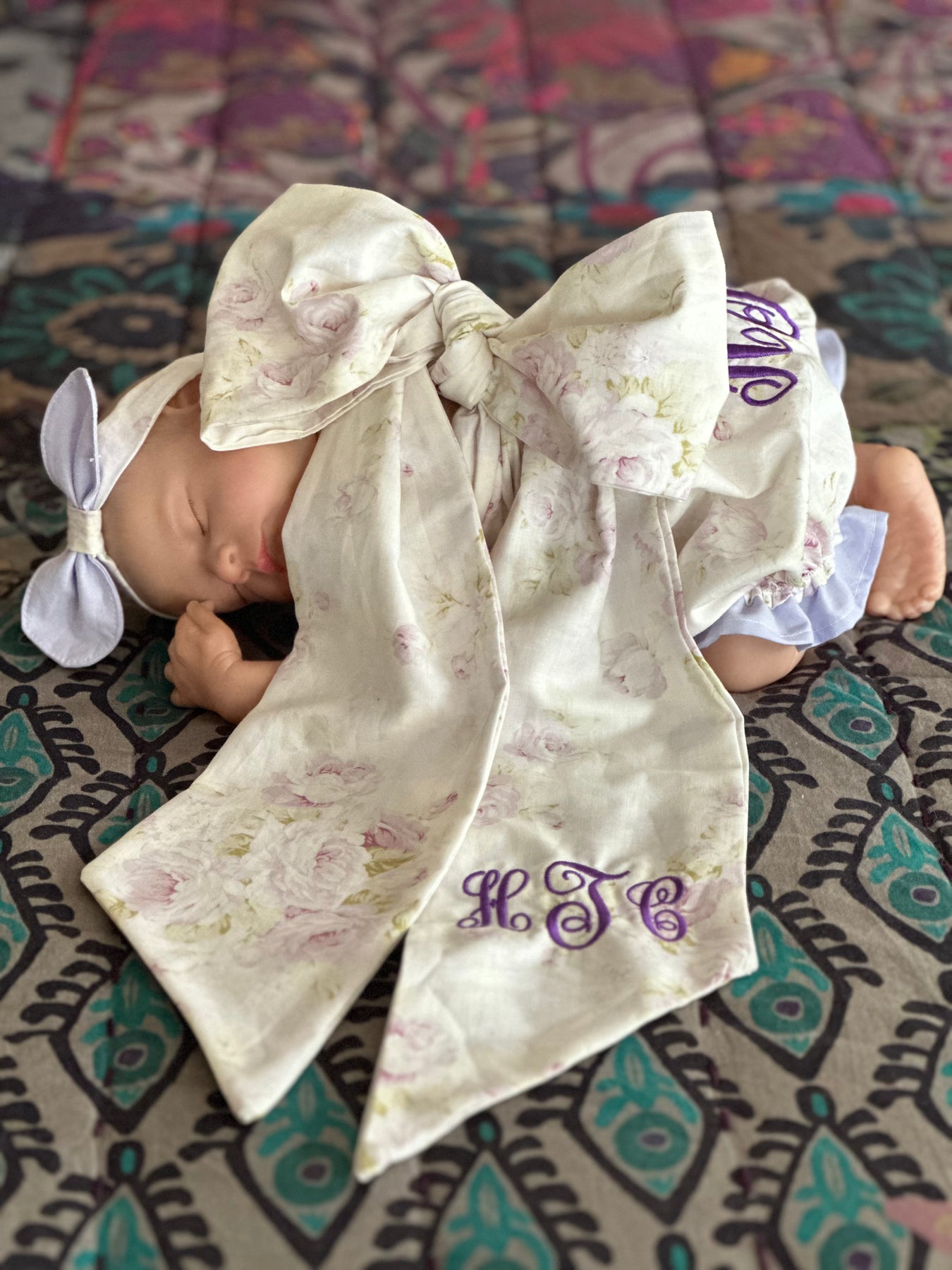 A timeless heirloom gift set designed for newborn photos, coming home outfits, and meaningful milestones.Handcrafted in Alabama, this three-piece set includes our signature ruffled bloomers, oversized heirloom bow, and classic baby headband.Personalization available to create a one-of-a-kind keepsake.